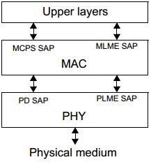 一个 LR-WPAN 设备至少需要一个 PHY 和一个 MAC 子层,其中 PHY 包括伴随着低等控制机制的射频(RF)收发机, MAC 子层为各种传输提供到达物理通道的接口。图 3 描述了它们之间的图形化关系,更详细的描述请参考 4.4.1 节和 4.4.2 节。